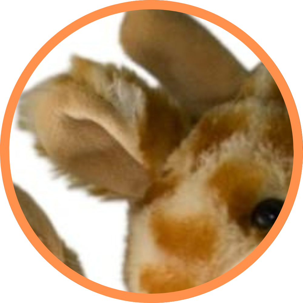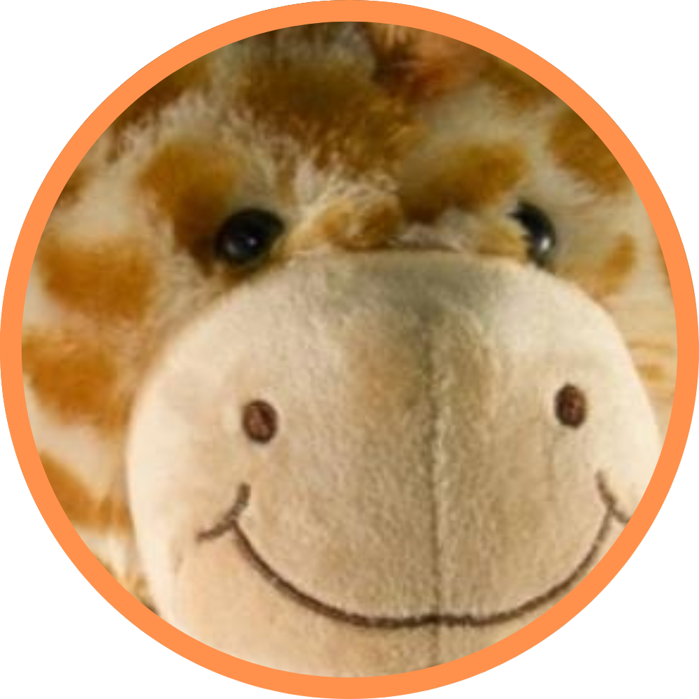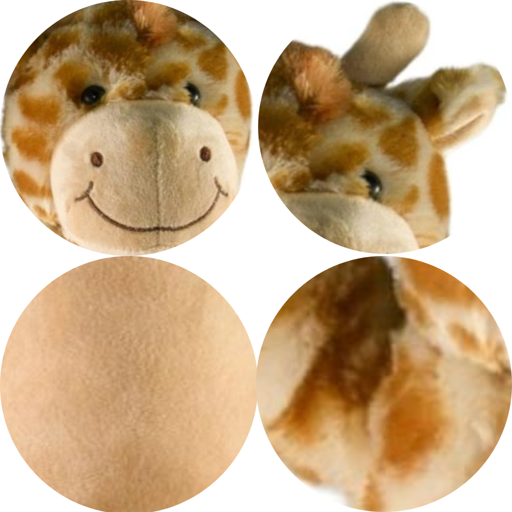 A loveable giraffe with patterned fur plush and contrasting brown hands, feet and antlers. His tummy, ears and snout are in a soft short cream plush with stitched mouth and black plastic eyes. His crowing glory is his mid plush mane down the back of his head.
