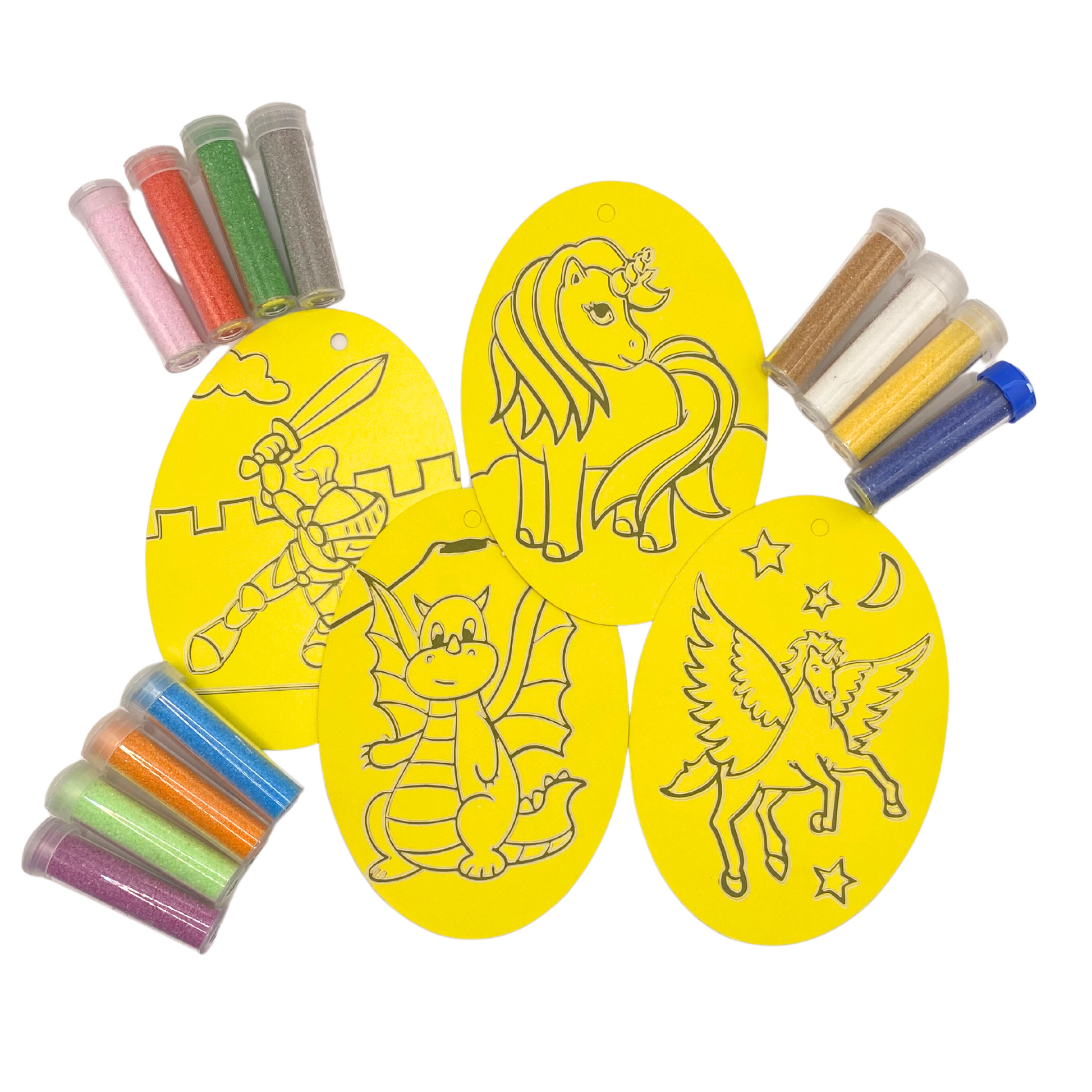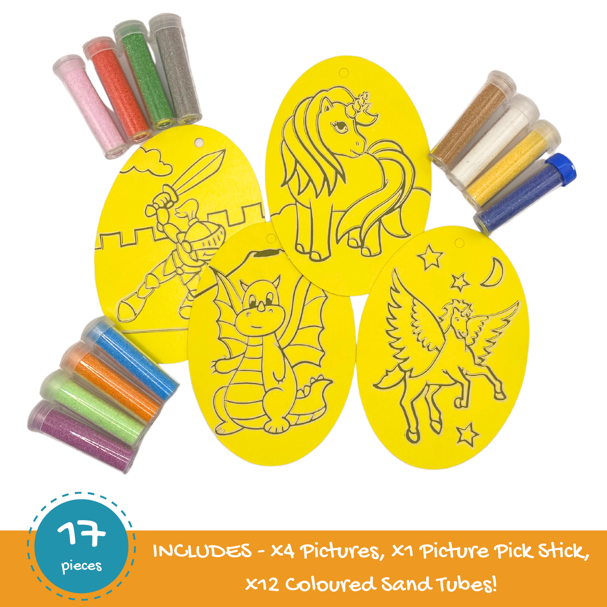 - Crafty kids will love this fun-packed Sand Art Activity. Simply select one of the pictures, peel off the backing and reveal the self-adhesive surface underneath. Grab your coloured sand from your sand art craft kit and carefully pour it on!