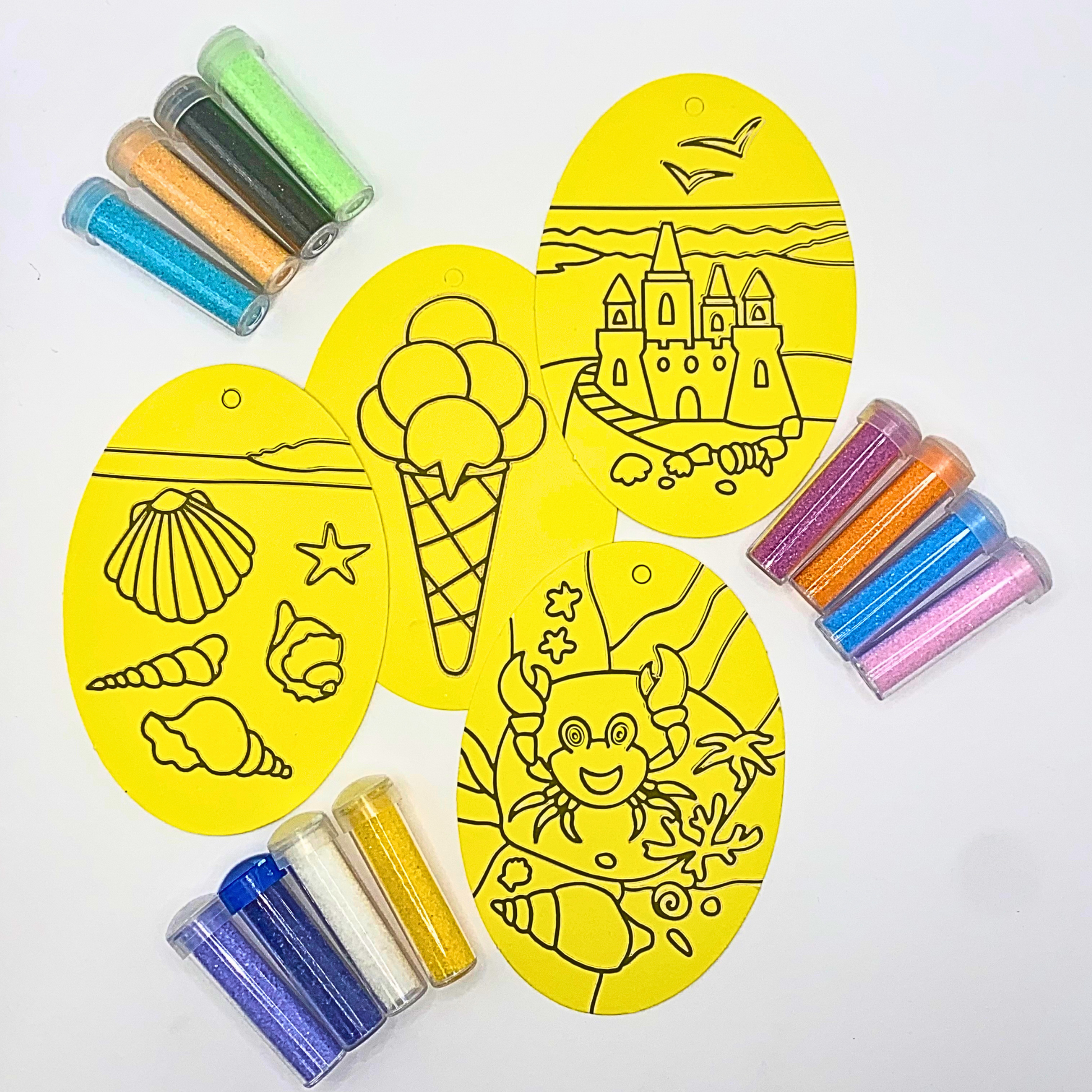 - Crafty kids will love this fun-packed Sand Art Activity. Simply select one of the pictures, peel off the backing and reveal the self-adhesive surface underneath. Grab your coloured sand from your sand art craft kit and carefully pour it on!