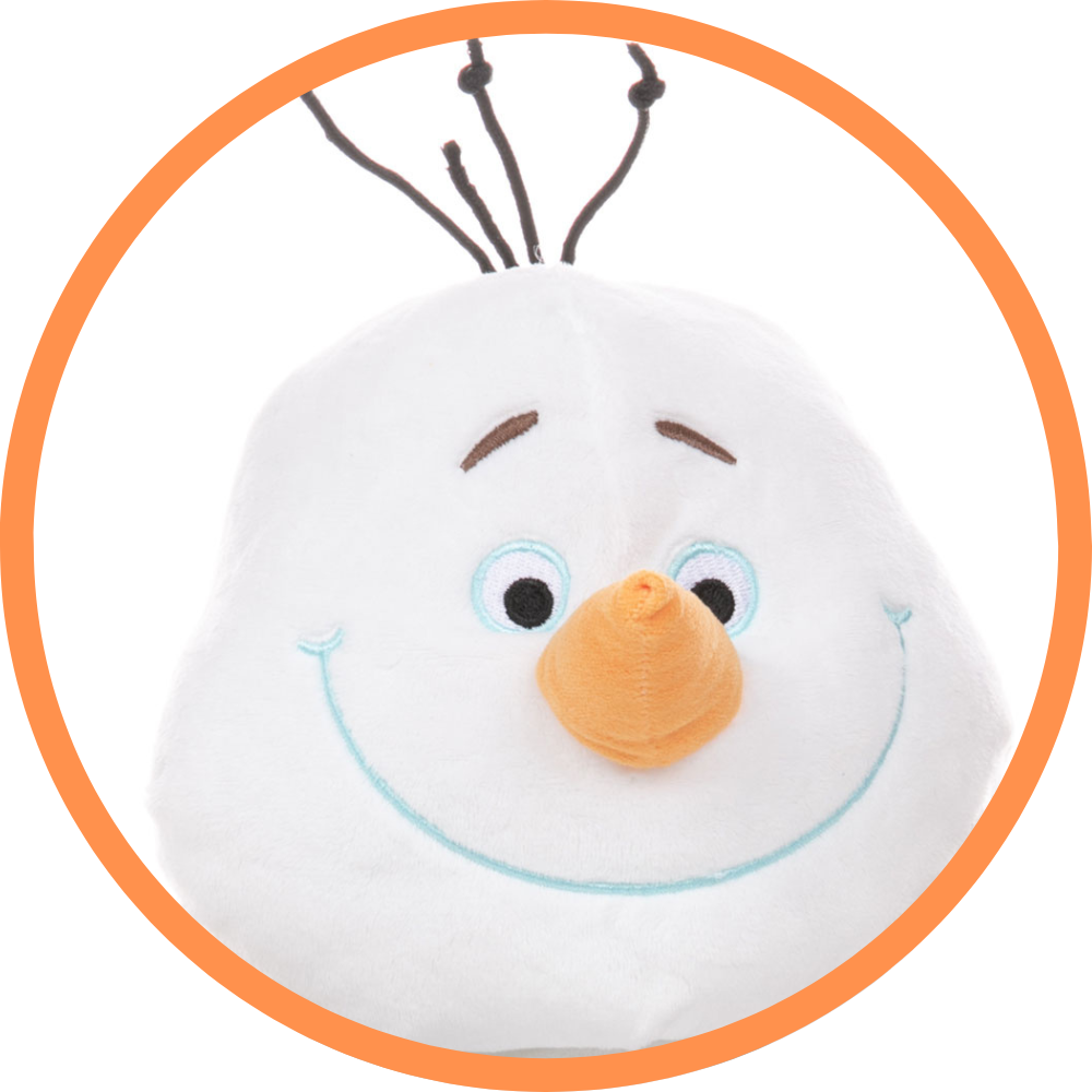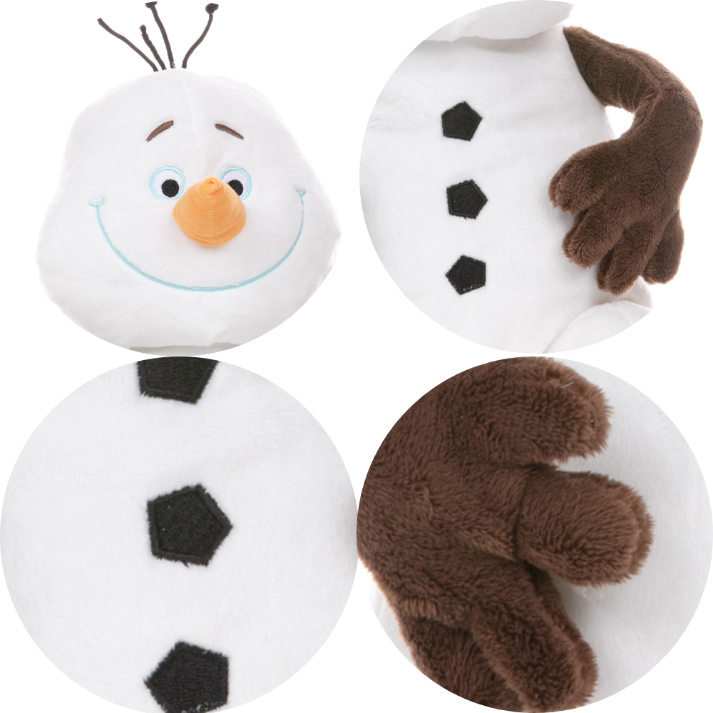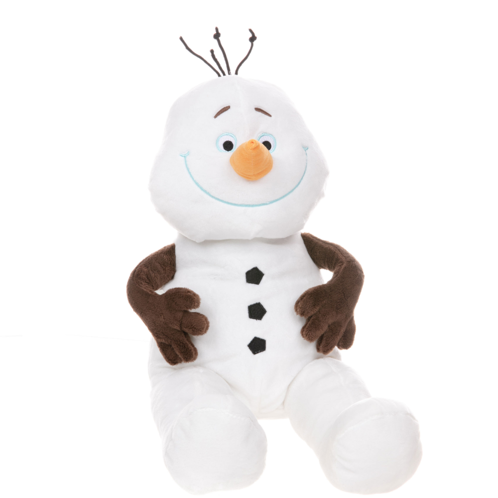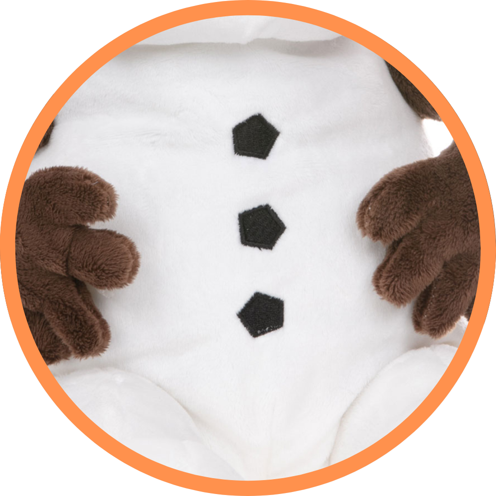 A seasonal friend that will melt your heart all year long! Made in short white plush with a traditional carrot for his nose and coal buttons. With brown twig arms, a huge smiley face and a few stands of black hair.